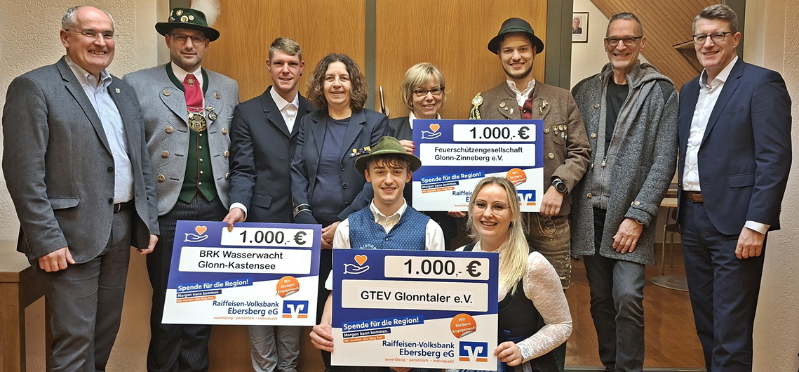 Die Raiffeisen-Volksbank Ebersberg setzt ihr Engagement für das lokale Ehrenamt fort und hat auf Initiative von Bürgermeister Josef Oswald insgesamt 3.000 Euro für die Jugendarbeit in der Gemeinde Glonn gespendet. Jeweils 1.000 Euro erhielten der GTEV Glonntaler, die Feuerschützengesellschaft (FSG) Glonn-Zinneberg sowie die BRK Wasserwacht Glonn-Kastensee.