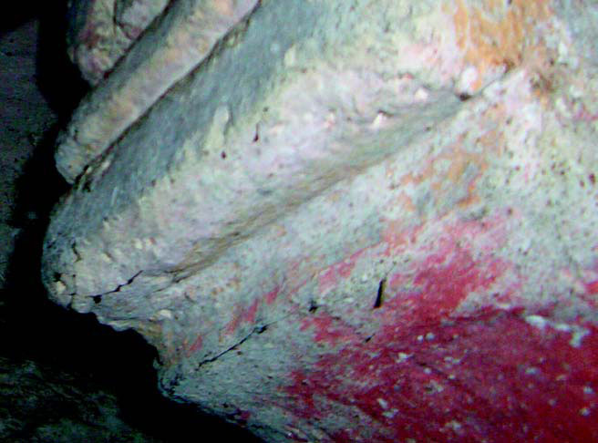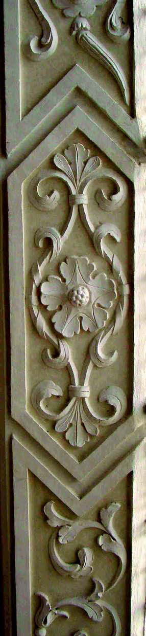 Auf der früheren Turmaußenseite das verzierte Kapitel der Säule und darüber die gotischen Blendarkaden.