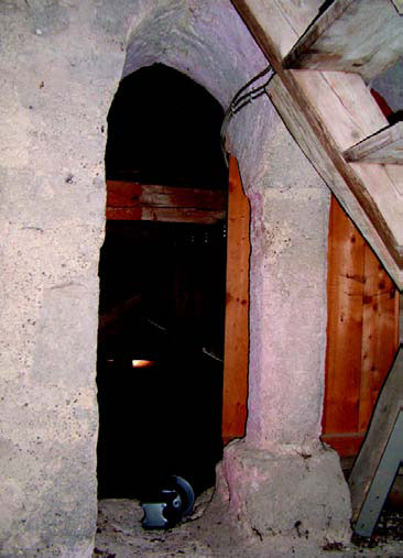 Vom Turm in den Langhausspeicher. Dieser Durchgang mit zwei gotischen Bögen war einst das Schallloch des Turmes der Vorgängerkirche.