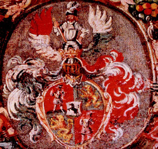 Wappen auf dem unterem teil des Deckengemäldes, das höchstwahrscheinlich auf die höger von anzing un derer von Schönbichl hinweist. Von dort stammte die frau von Benno Höger.