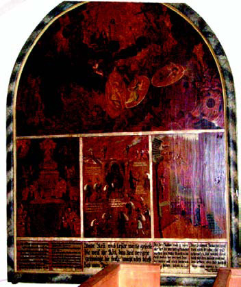 Laut Karl von Spieß basieren die Gerichtsmühlendarstellungen letztlich auf dem Jedermann-Thema. Das Mühlenrad wird gestalterisch als Lebens- oder Schicksalsrad gedeutet. Christus ist der Müller, der die von den Sündern herangetragenen Säcke auf das Mühlrad schüttet. Die Gottesmutter Maria und der Erzengel Michael sehen dabei zu. Aber auch der Satan ist mit von der Partie. Verschiedene Verse erläutern das Geschehen und weisen auf die Folgen eines sündhaften Lebens hin, wie zum Beispiel: „Die nit geglaubt an Gottes Wordt, die bekommen in der Höll ihr Ohrt.“ Auf dem linken Bildteil ist das Bußsakrament und auf dem rechten die Versinnbildlichung der Liebe zu Gott das Thema. Über allen drei Gemälden spannt sich bogenartig das Jüngste Gericht.