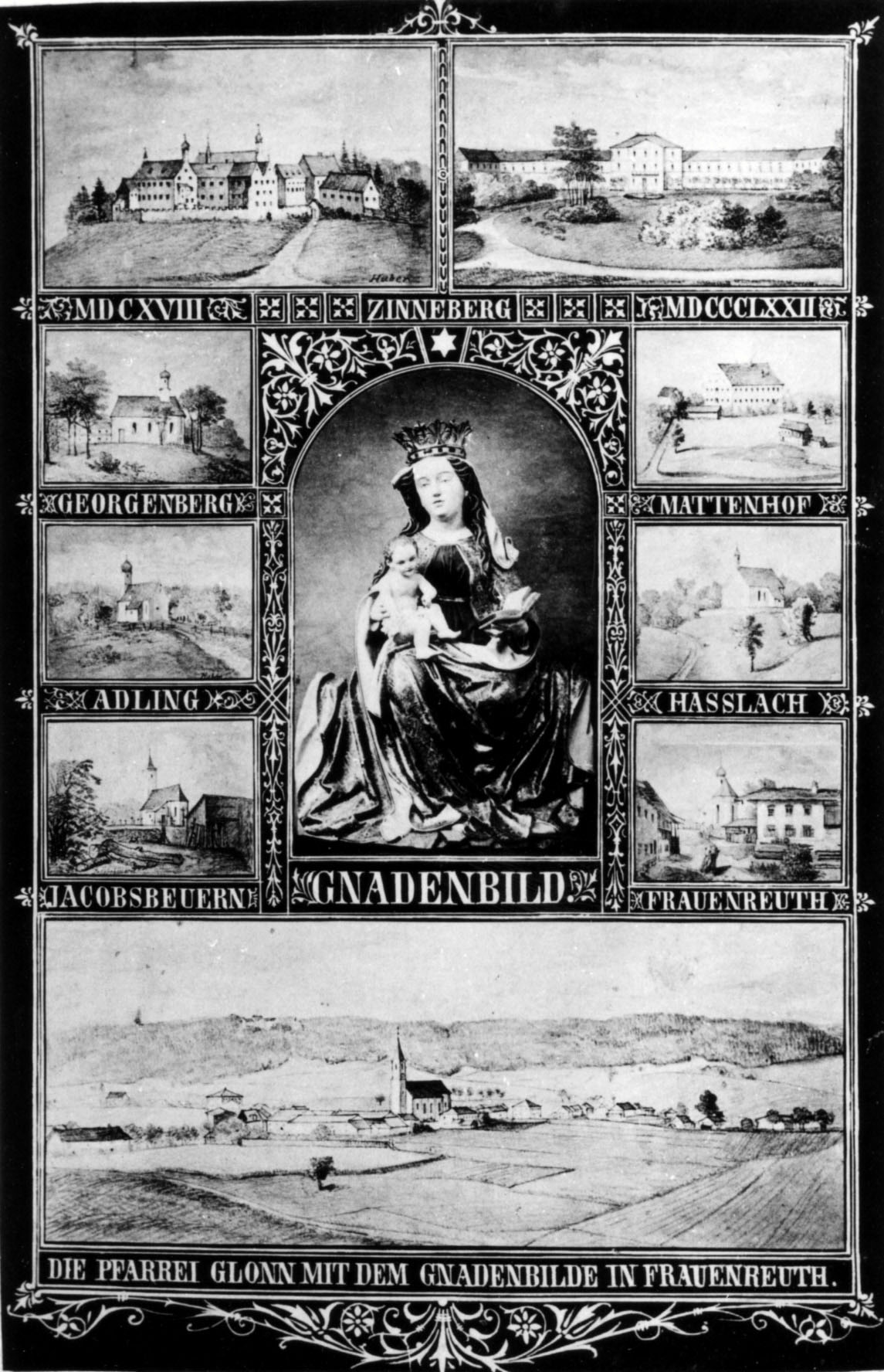 Erinnerungskarte von 1872, in der Mitte das Frauenreuther Gnadenbild, oben Schloß Zinneberg, links die Kirchen von Georgenberg, Adling, und Jakobsbeuern, rechts Schloß Mattenhofen, die Kirche von Haslach und eine Dorfszene aus Frauenreuth. Unten das Dorf Glonn.