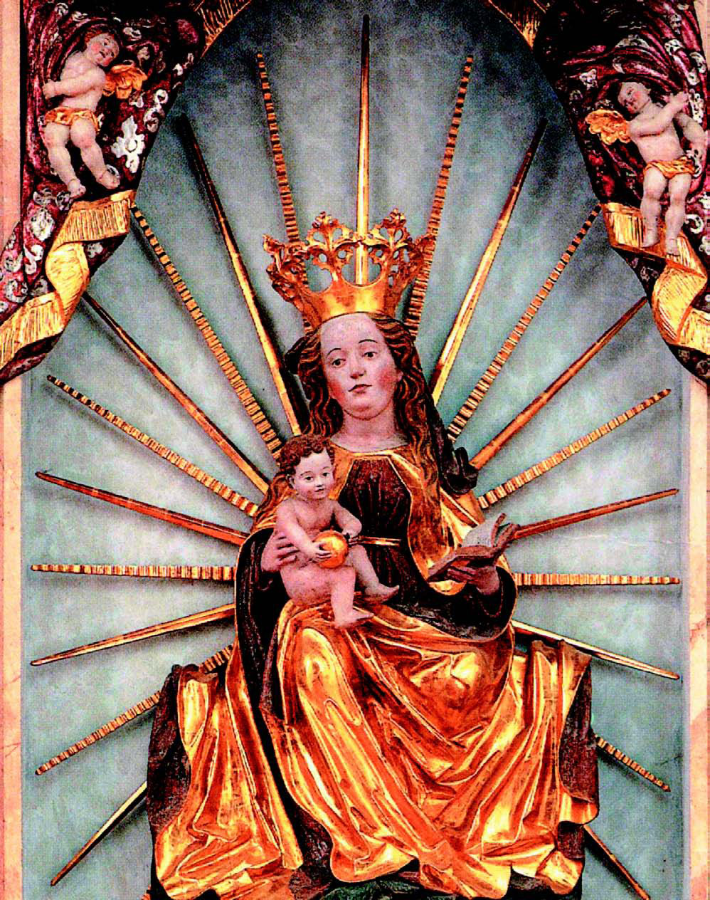 Zur Innenausstattung: Mittelpunkt ist natürlich nach wie vor die um 1500 geschaffene Muttergottes, eine aus der „Zeit der schönen Madonnen“. Auf dem Votivbild von 1828 wird sie noch in Kleidern gezeigt, vielleicht gilt dies sogar bis zur Renovierung von 1872. Wie schon auf dem Gutweinstich vom ausgehenden 17. Jahrhundert hält sie sitzend das aufgeschlagene Buch in ihrer Linken, als wollte sie uns auf die Heilige Schrift hinweisen. Ihr Blick aber ist auf das mit ihrem rechten Arm gehaltene, Kind gerichtet das anscheinend mit der Weltkugel spielt, als wollte sie sagen: Lass die „Welt“ nicht fallen. Dies alles ist nur Deutung. Von Bedeutung ist, dass Generation um Generation von der Frauenreuther Muttergottes Hilfe erbeten und wohl auch erhalten haben.