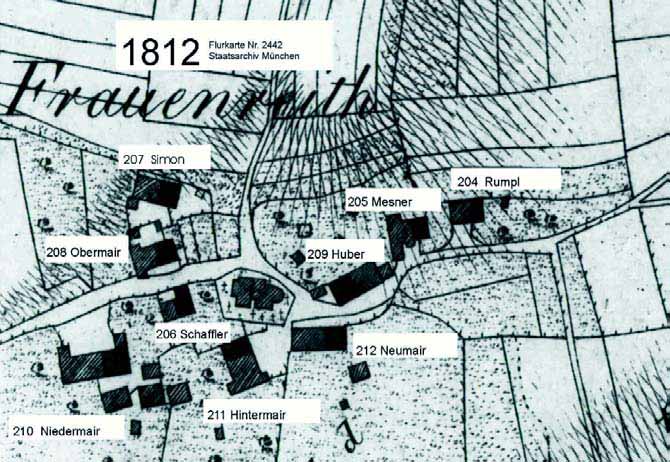 In Frauenreuth gibt es also, einschließlich dem „Simer“, sieben Anwesen, deren Hausnamen auf eine Teilung hinweisen: Ober-, Nieder-, Hinter-, Neu- und Mesmair, sowie den Huber. Die zwei weiteren, Rumpl und Schaffler im Eigentum der Ortskirchen, könnten Schenkungen zum Unterhalt der Kirche sein und so ebenfalls aus einer Teilung resultieren. Diese Tatsachen sprächen dafür, dass die Besiedlung von Frauenreuth von einer einzigen Hofstelle, vielleicht einem Maierhof, ausging. Dabei sind weitere Rodungen nicht auszuschließen.