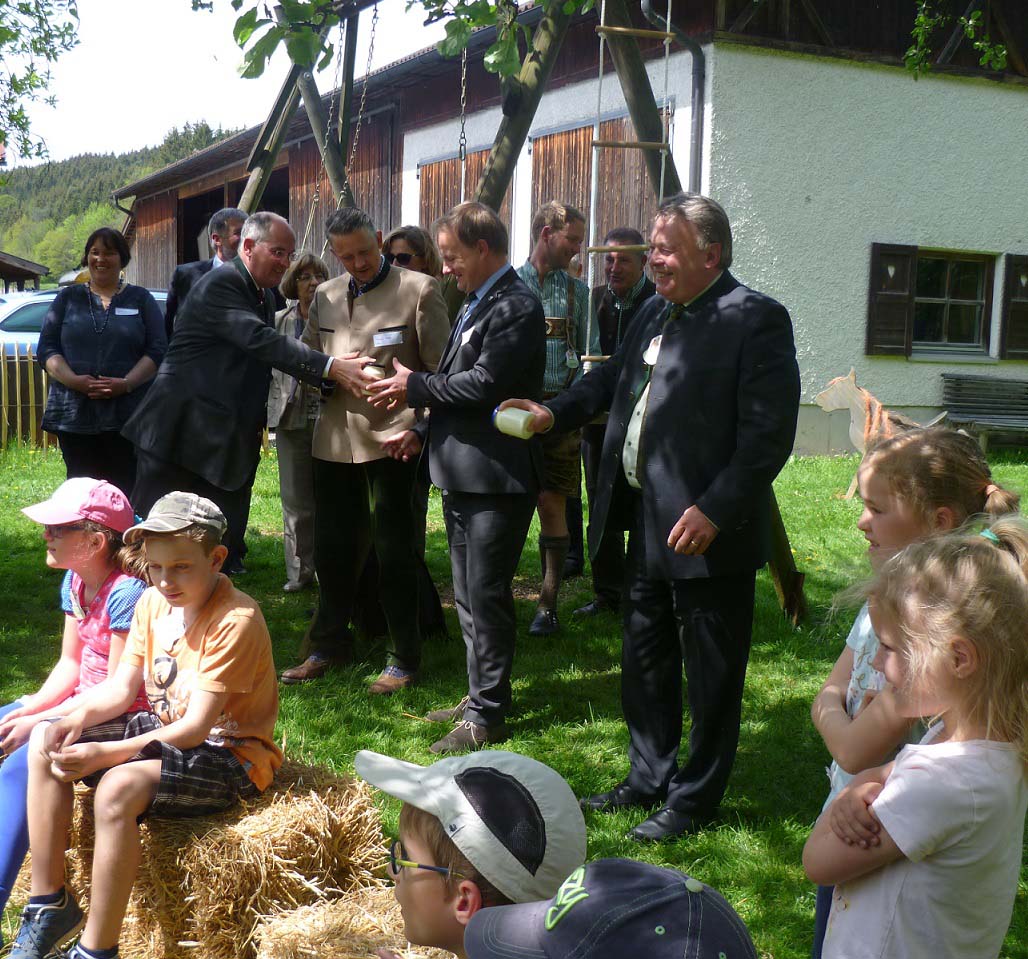 Am 9. Mai hat der Landwirtschaftsminister Brunner in Reisenthal auf dem Bauernhof der Familie Esterl die bayernweite Projektwoche „Erlebnis Bauernhof“ eröffnet. Nach einer kurzen Begrüßung durch Julia und Sebastian Esterl hielt Landwirtschaftsminister Brunner eine sehr kindgerechte Ansprache. Dabei befragte er die Kinder nach deren Eindrücken vom Vormittag auf dem Bauernhof. Aus den Antworten der Kinder der Luise-Kiesselbach-Grundschule aus München wurde sehr deutlich, dass den Kindern der Vormittag sehr gut gefallen hat, sie dabei einiges lernten und am liebsten „jeden Tag“ da wären. Im Anschluss an die Ansprachen haben die Kinder mit Landwirtschaftsminister Brunner, dem Landtagsabgeordneten Huber, Landrat Niedergesäß und Bürgermeister Oswald um die Wette „Butter geschüttelt“ und den selbstgemachten Butter probiert. Julia und Sebastian Esterls idyllisch gelegener Hof gehört zu 650 Erlebnisbauernhöfen in Bayern.