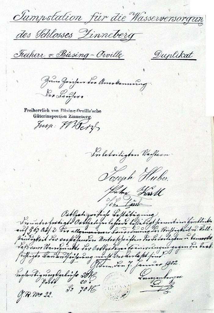 Von 1899 bis 1927 war der Besitzer von Schloss Zinneberg mit dem Aufkaufen der Bauerngüter in der Umgebung beschäftigt. Adolf v. Büsing war übrigens von bürgerlicher Geburt. Das Archiv in Büsings Heimatstadt Offenbach berichtet, der Industrielle habe sich den bayerischen Adelstitel verleihen lassen und nannte sich daher Freiherr Adolf v. Büsing-Orville.