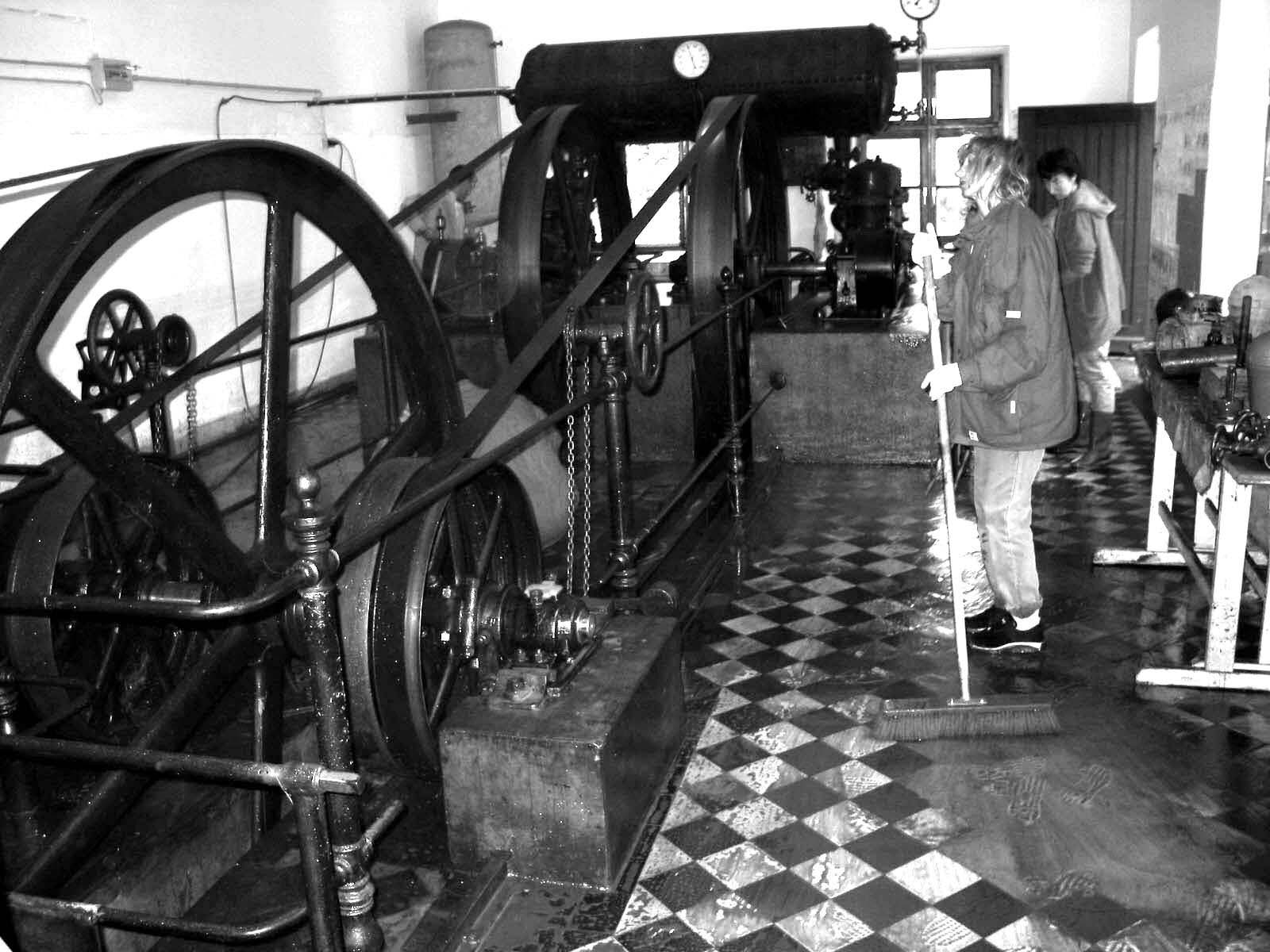 In der Stegmühle wurde noch tagelang eifrig geschrubbt, um Schaden von der historischen Stromerzeugungsanlage abzuhalten. Die alte Turbine hat das Hochwasser schließlich überstanden.