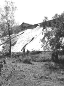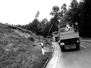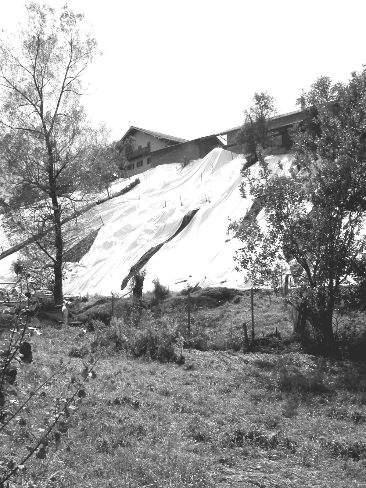 Noch schlimmer als die Verluste beim Mobiliar waren die Unstetigkeiten der Hänge, die sich wenige Stunden nach den Überschwemmungen manifestierten. In Haslach und im Mühlthal drohten ganze Wiesen abzurutschen, die Häuser mitzureißen oder unter sich zu begraben. Das eigens alarmierte Expertenteam der Bundeswehr untersuchte den Boden an den gefährdeten Stellen und stellte fest, dass die Grasnarbe tatsächlich stark unterspült worden war. Es bestand akute Abrutschgefahr für komplette Wiesen. Mit großflächigen Planen wurden die Hänge gesichert. Das Bild der „eingepackten“ Hangwiesen erinnerte noch Wochen nach dem Hochwasser an die bedrohlichen Stunden. Schließlich half sich die Natur aber doch selbst. Nachdem die Regenfälle aufgehört hatten verwuchs die Grasnarbe mit dem Untergrund und nirgends wurde ein Haus weggerissen. Andere Hänge waren allerdings schon in der Nacht zum Sonntag nicht mehr zu retten. Der Schaden an der Oberpframmerner Straße erinnerte noch einige Zeit an diese Nacht. Das Erdreich hatte sich an einem steilen Hang im Quellgebiet der Glonn gelöst. Die Straße hing an einer Stelle frei in der Luft und die darunter liegenden Stromleitungen waren zu sehen. Die Sanierung dieses Straßenabschnittes war auch eine der ersten Baumaßnahmen, die nach dem Hochwasser in Angriff genommen wurden – auf Kosten des Landkreises übrigens. Der Verkehr floss bis zur Wiederherstellung dieses Abschnitts über Egmating, wo die Sanierung des Abrutsches an dem Hang bei Reinstorf nicht so dringend für die Verkehrssicherheit war. Im September wurde die Strecke nach Oberpframmern wieder freigegeben.