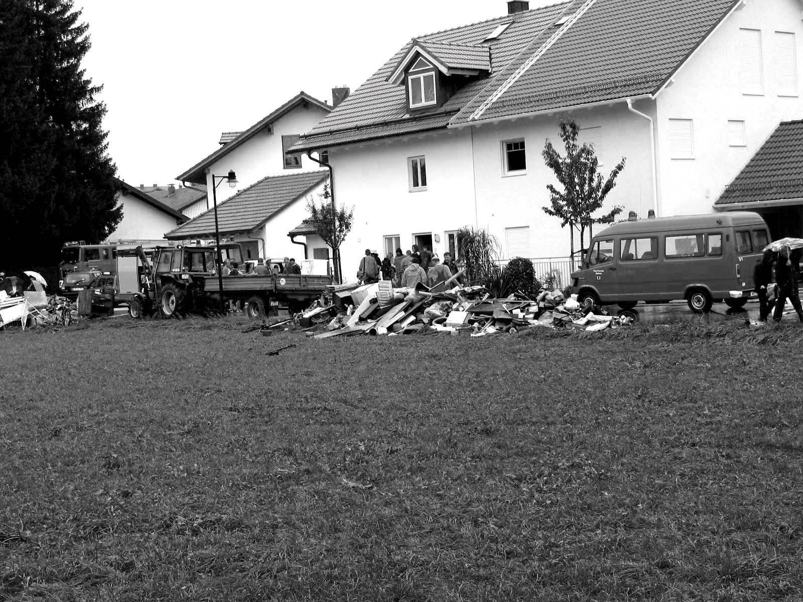Zur gleichen Zeit waren weiter in Richtung Ortsmitte allmählich alle überschwemmten Keller ausgeräumt. Noch immer pumpte die Feuerwehr das Regenwasser aus, während an manchen Stellen das Grundwasser von unten schon wieder nachdrückte. Die Besitzer der teils gerade erst fertig gewordenen Neubauten schafften ihre überschwemmten Möbel, Waschmaschinen und Gefriertruhen aus den Kellern auf den Gehsteig. Die Kugelfeldstraße glich einem einzigen Sperrmülldepot. Auch in der Wiesmühlstraße und im Klosterweg waren viele Häuser überschwemmt. In der Woche darauf übernahm die Gemeinde kostenlos die Abfuhr der unbrauchbar gewordenen Einrichtungsgegenstände, die häufig noch nagelneu waren. Der Landkreis hat bei der Entsorgung auf die Deponiekosten verzichtet. Übrigens sollen angeblich einige Bürger von der kostenlosen Sperrmüllsammlung Gebrauch gemacht haben, die gar nicht vom Hochwasser betroffen waren. Aber solche Kleinigkeiten wurden in der Woche nach dem Unglück stillschweigend übersehen.