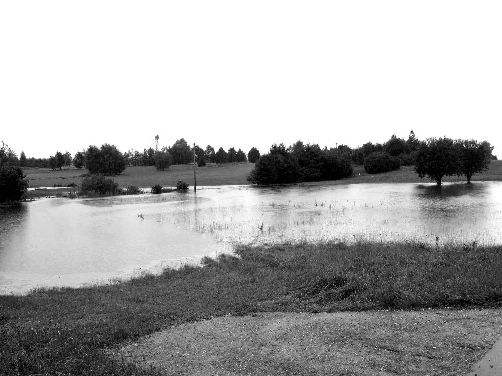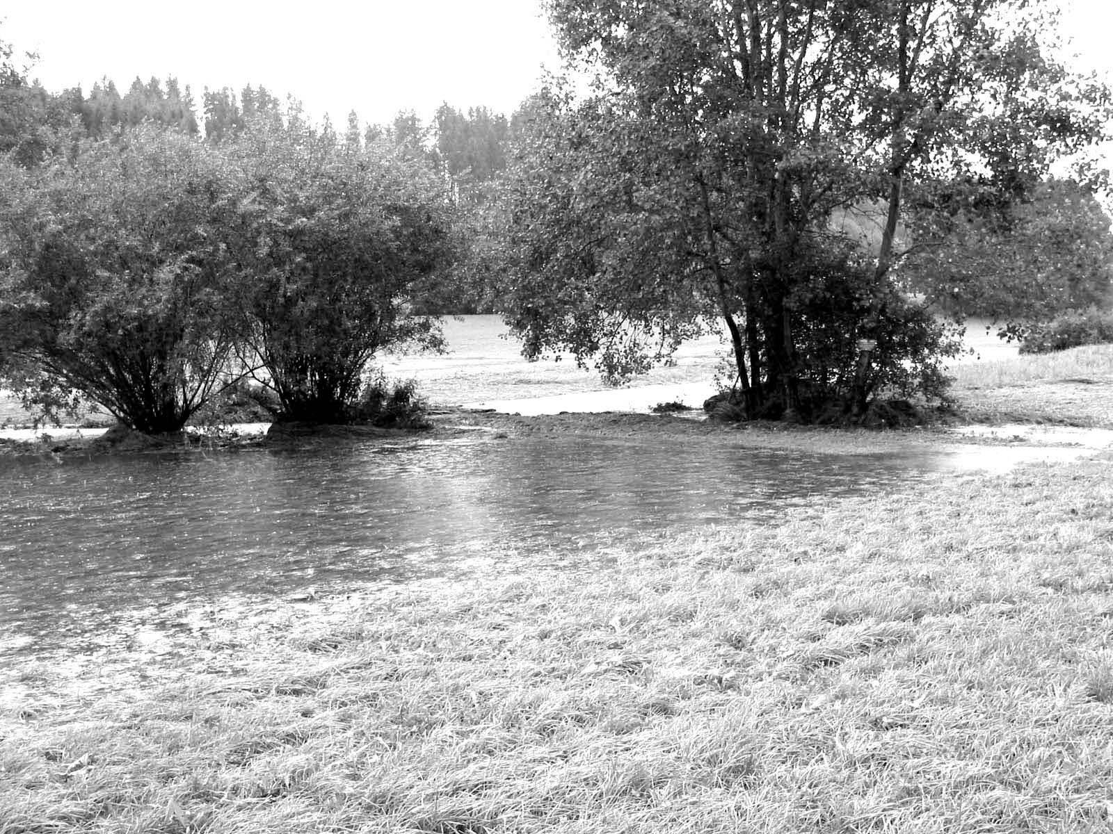 Sechs Kilometer entfernt und rund 100 Meter höher verbrachten die Bürger in Egmating eine zwar regnerische Nacht, in der aber nichts Schlimmeres passierte als dass einige Grillabende ins Wasser fielen. Aber daran war man in diesem August ja gewöhnt. Ich erhielt erst am Sonntagmorgen eine Ahnung von dem dramatischen Szenen, die sich in der Nacht zuvor ereignet hatten. Im Radio wurde gemeldet: „Die Ortsdurchfahrt von Glonn, Landkreis Ebersberg, ist wegen Hochwasser gesperrt.“ Für mich gab’s nach dieser Meldung natürlich kein Zögern: Ich packte meine Kamera und einen Block, setzte mich ins Auto und fuhr Richtung Glonn. Der Golfplatz hinter Egmating war schon seit längerem eine einzige Seenlandschaft. Der bekannte Anblick hatte sich jetzt höchstens ein wenig verstärkt: Die einzelnen Seen flossen nun in ein einziges, großes Golfplatz-Meer zusammen. Im Egmatinger Forst deutete nur wenig auf die Ereignisse der vergangenen Nacht hin. Es roch nach Erde und Regen, aber so richtig beunruhigend sah es hier noch nicht aus.