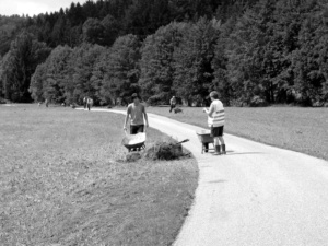 Nachdem die Ausflügler eine angemessene Zeit im Auto gewartet hatten und die Straße wieder halbwegs befahrbar wirkte, ging es – wenn auch nicht richtig problemlos – weiter hinunter nach Glonn. Unterhalb von Kreuz, wo mittlerweile der Hang abgerutscht war. lag die Erde lag auf der Straße und machte das Passieren unmöglich. Die hier positionierte Polizei empfahl einen Umweg, der nicht der letzte auf dieser Hindernisfahrt ins Tal war. Schließlich mussten die Ausflügler auch noch den unter Wasser stehenden Marktplatz umfahren. Es war jetzt ungefähr 21 Uhr und überall standen die Leute, die Helfer und alle, die sich sonst noch auf die Straße getraut hatten, bis über die Knie ins meistens schlammige Wasser. Als Angelika Kronthaler mit den Mädchen endlich daheim angelangt waren, wurden sie vom Gatten Franz, der seit zwei Stunden das Wasser aus den Ergeschossräumen schrubbte, in seiner herb-wortkargen Art empfangen: „Bist aa scho do?“. Nun war es bei Kronthalers halt auch passiert und von da an waren sie dann schon zu zweit beim Schrubben. Recht viel mehr Helfer waren nicht zu erwarten, denn alle Nachbarn waren selbst damit beschäftigt, das Wasser aus ihren Erdgeschossräumen zu schrubben oder noch schlimmere Auswirkungen des großen Regens zu bekämpfen. Manche Glonner waren in Urlaub Wochenende und wurden erst verspätet mit dem Drama konfrontiert. Bei Gröbmayrs von gegenüber waren nur die fast schon erwachsenen Kinder daheim, die mit dem vergleichsweise milden Wassereinbruch im Keller selbst zurechtkamen. Igendwann klingelte dann das Telefon in der Metzgerei Kronthaler, ein sehr altes Modell, mit dem man eigentlich gar nicht telefonieren kann. Aber man kann angerufen werden und die Kronthalers waren in dieser Nacht ungefähr die einzigen Glonner, die angerufen werden konnten. Das war auch nötig, denn viele Brotzeiten waren noch erforderlich in dieser Katastrophen-Nacht. Diesmal bestellte die Feuerwehr eine Stärkung, die natürlich sofort zubereitet wurde, dann aber auch wieder erst unter höchst ungewöhnlichen Umständen zu ihren Empfängern gelangte. Das Kronthaler´sche Auto war nämlich mittlerweile hinter dem elektronischen Garagentor in Zeiten des Stromausfalls unerreichbar versperrt. Der Huberwirts-Hansi war es schließlich, der die Brotzeit gegen 22 Uhr zu den Helfern brachte, die sich allmählich an den Gedanken gewöhnten, dass dieser Einsatz länger dauern würde als jeder zuvor.