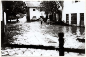 Mein Sohn Martin, damals neun Jahre alt, war an diesem Wochenende zu seiner Glonner Oma in die Zinneberger Straße gefahren und hatte sich sich zur fraglichen Zeit bereits erwartungsvoll auf dem Sofa postiert, in der festen Absicht, mindestens die halbe Nacht vor dem Fernseher zu verbringen. Seine Freude währte allerdings nicht lange: Als der Strom abgeschaltet wurde, war die Mattscheibe schwarz und daran änderte sich die nächsten Stunden nichts mehr. Die Zinneberger Straße gehört zu den höher gelegenden Gegenden im Osten Glonns. Es floss hier zwar auch viel Wasser den Berg hinunter, aber so dramatisch wie anderswo war es nicht. Immerhin stand bald auch gegenüber beim BMW Maier das Wasser im Hof und die Feuerwehr war zur Stelle, um den vollgelaufenen Keller auszupumpen. Dieses Schauspiel bildete aus Martins Sicht dann doch einen halbwegs akzeptablen Ersatz für den entgangenen Fernsehgenuss. Was allerdings gleichzeitig in dieser Nacht in Glonn sonst noch alles los war, das erfuhren die Großeltern und ihr Enkel erst am nächsten Tag. Zwar hatten sich die Nachbarn angesichts des Feuerwehreinsatzes und des Wassers, das vom Zinneberger Berg herunter beim Maier in den Keller lief, über die Gewalt des Naturereignisses ausgetauscht. Aber da keine Nachrichten über Telefon oder Handy hin- und hergingen, blieb jeder Hausbesitzer – außer in den großflächig überschwemmten Gegenden – mit seiner privaten Katastrophe weitgehend für sich. Erst im Anblick des Sperrmüllmobiliars wurde die Dimension des Ereignisses klar: „Ich bin dann am nächsten Tag mit der Oma nach Glonn reingegangen und auf dem Gehsteig sind überall kaputte Waschmaschinen und Gefriertruhen rumg’standen,“ erinnert sich Martin an seine Hochwasser-Eindrücke.
