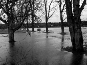 Als sich die Lage sich am Sonntagnachmittag allmählich zu entspannen begann, erhielten manche Einsatzkräfte auch mal einen Auftrag in einem günstigen Umfeld. In der Wiesmühl-Wirtschaft zum Beispiel konnten die Glonner Feuerwehrleute eine kurze Pause einlegen und wurden von den Hausleuten trotz allem Stress liebevoll bewirtet. Während der Sepp in Gummistiefeln bis über die Knie immer wieder in den überschwemmten Keller watete um die Saugleistung der Pumpe zu kontrollieren, vergewisserte sich der Xare, dass das überschwemmte Schwimmbad keinen weiteren Schaden genommen hatte. Der Handlungsspielraum für die Schwimmbad-Betreiber war allerdings gering, denn vor dem Haus erstreckte sich nicht das bekannte, malerische Naturschwimmbad in seiner gemauerten Fassung, sondern ein scheinbar endloser See, der nahtlos in die Überschwemmungen im Kupferbachtal überging. Ein ganz ähnlicher Anblick ist übrigens auf einigen alten Fotos vom Hochwasser 1940 dokumentiert.