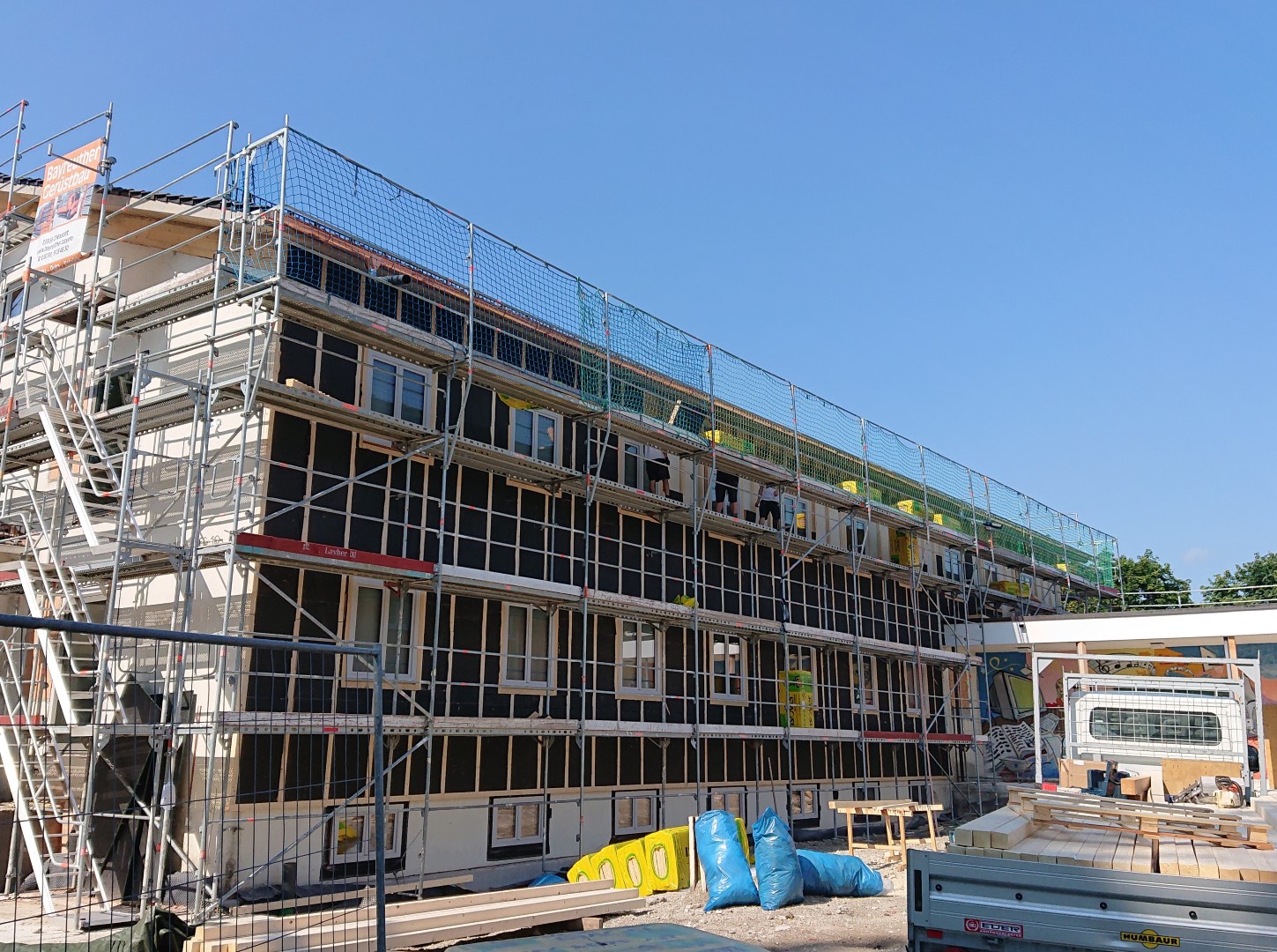 Letzte Woche ist mit den Dämmarbeiten an der Holzfassade begonnen worden.