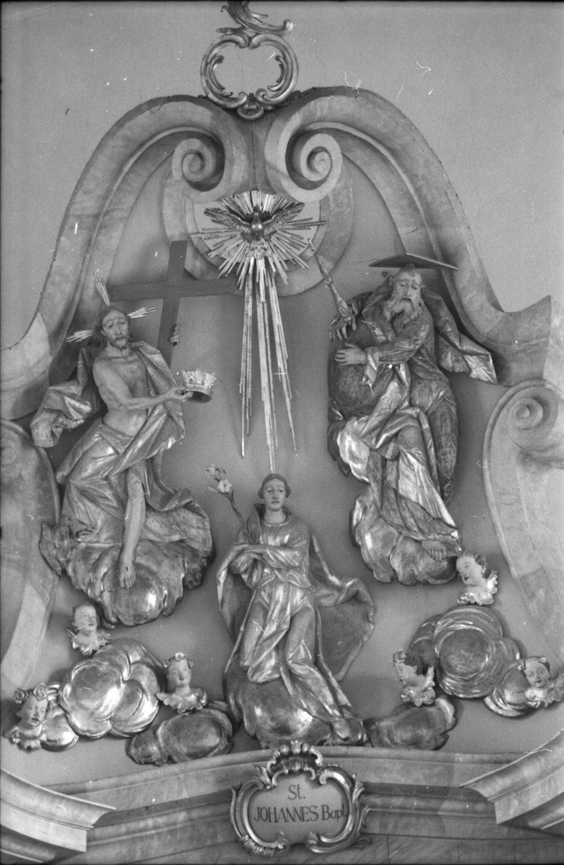 In Dehios „Handbuch der Kunstdenkmäler in Oberbayern“ wird die Kirche St. Johannes Bapt. zu Glonn mit ganzen vier Zeilen bedacht. Das Buch ist freilich schon 1952 erschienen. Erst zwei — drei Jahre vorher entdeckten meine Schulbuben auf dem Langhaus der Kirche große und kleine Holzplastiken aus dem 18. Jh. Staub und Fledermäusekot hatte sie be­graben. Zwei kunst- und kircheninteressierte Glonnerinnen holten mit Wasser aus Feuer­wehrschläuchen einen Petrus und einen Paulus aus ihren Schmutzpanzern. Die anmutige Krö­nungsmadonna stellten sie sogleich in den strahlenden Feldblumenjubel ihres Prozes­sionsaltars. Pfarrer Alois Raab erlaubte den ersten Wiedereinzug der aufgefundenen kost­baren Figuren ins Kirchenschiff. Der Maler Prof. Sepp Hilz erkannte sie als Werke des rühmlichen Rokokoschnitzers Joseph Götsch. Die Restauration von 1958, der Pfarrer Loithaler seinen Willen lieh, hat mit den Irrtümern der Restauratoren des 19. Jahrhunderts aufgeräumt. Die Gestalt des Hochaltars, die den Seitenaltären von Rott a. Inn nahegekommen sein dürfte, war nicht wieder aufzubringen. Der ursprüngliche Tabernakel ging verloren. Wohl oder übel mußte man sich auch für das Dreiviertelrelief der Taufe Jesu mit einem neuen, sachlich-nüchternen Gehäuse begnü­gen, welches aber die plastische Szene zu sehr von den zwei großen und großartigen Apostelgestalten trennt. Auch der landschaft­liche Hintergrund ist nur zum Teil noch original.