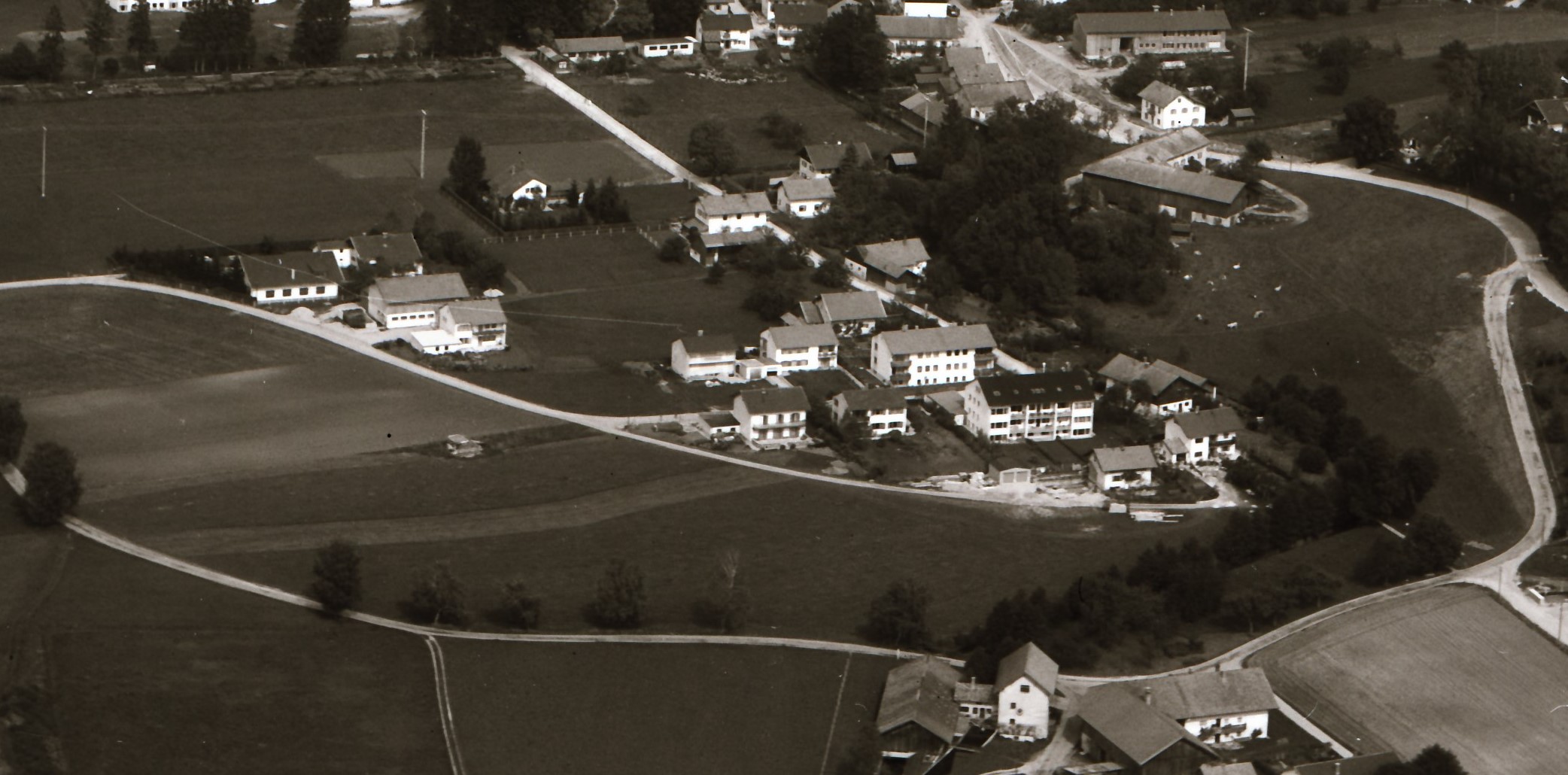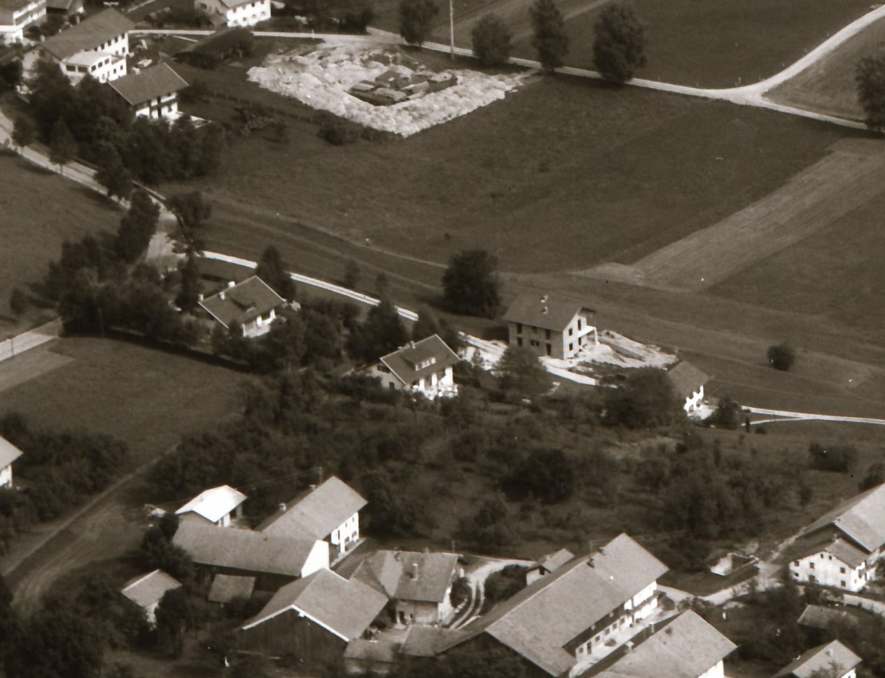 „Am Berg“ mit dem ersten von drei gepanten Neubauten, ca. 1967; Bild: ArchivMarktGlonn/Luftbildverlag Bertram hier zur Vergrößerung