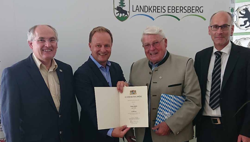 Auf dem Bild von links nach rechts: Bgm. Josef Oswald, Landrat Robert Niedergesäß, Robert Esterl, Hans Rumpfinger – Leiter des Vermessungsamtes Ebersberg