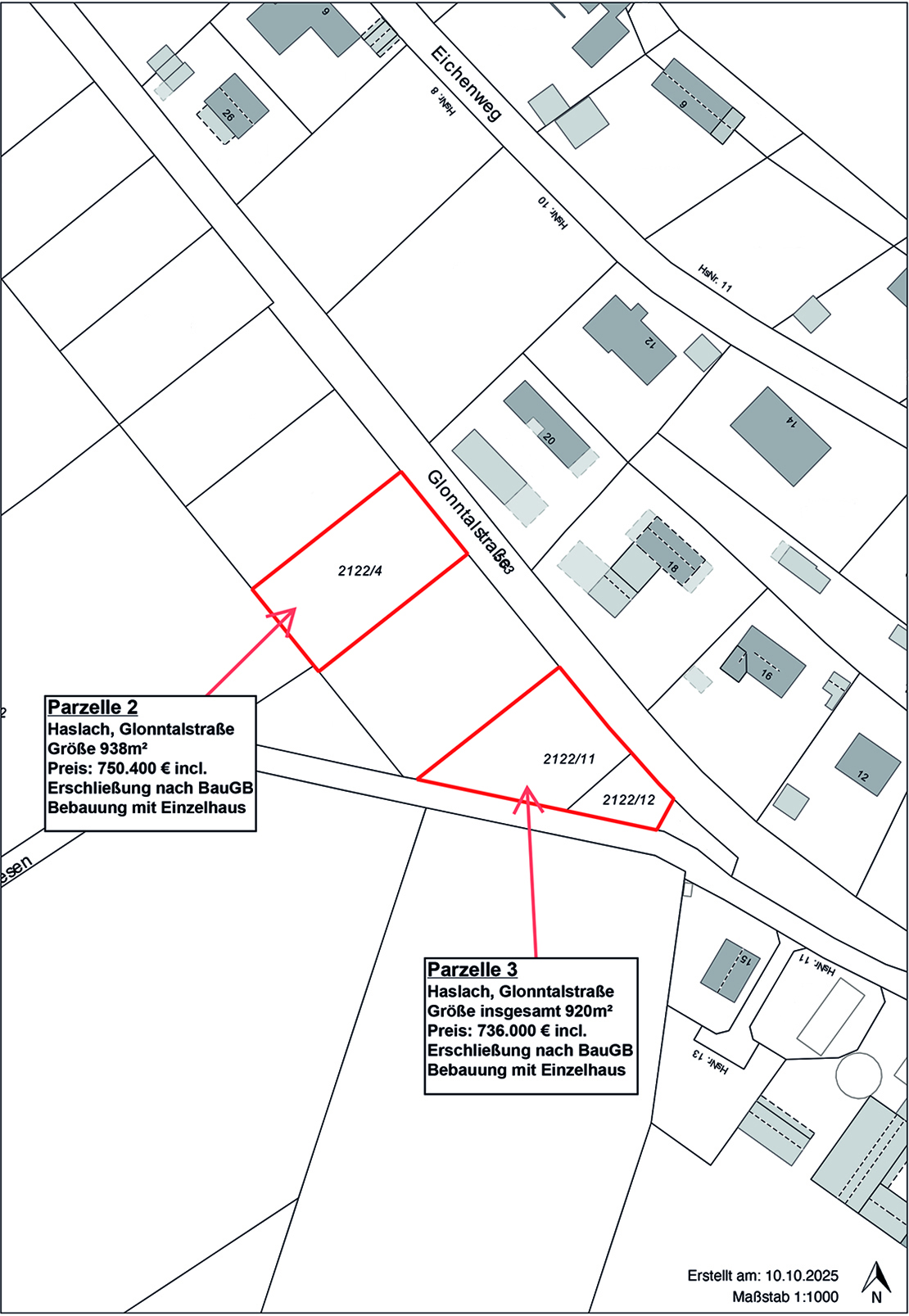 Die Marktgemeinde Glonn bietet insgesamt drei Parzellen nach den aktuell gültigen Richtlinien der Marktgemeinde Glonn für die Vergabe von Wohnbaugrundstücken zum Kauf an. Parzelle 1 mit einer Größe von 710 m² liegt in Schlacht, Am Hochrain. Parzelle 2 mit 938 m² liegt ebenso wie Parzelle 3 mit 920 m² in Haslach an der Glonntalstraße.