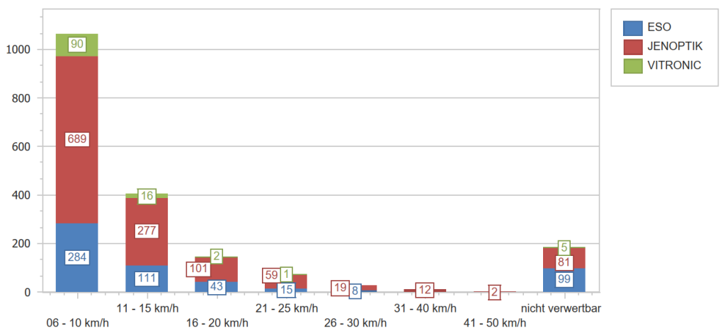 Erfreulicherweise wurden nur wenige „große“ Geschwindigkeitsüberschreitungen festgestellt. Die Anzahl der Fälle mit der überschrittenen Geschwindigkeit ist der Grafik zu entnehmen.